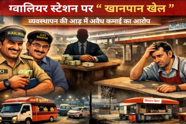 मीणा बंधु और एसीएम पर मिलीभगत के गंभीर आरोप, लाइसेंसी ठेकेदारों से ‘सेटिंग’ का खेल उजागर ग्वालियर। ग्वालियर रेलवे स्टेशन पर चल रहा पुनर्विकास कार्य जहां एक ओर सुस्त रफ्तार का शिकार है, वहीं दूसरी ओर खानपान इकाइयों के व्यवस्थापन के नाम पर वाणिज्यिक विभाग में कथित तौर पर अवैध कमाई का खेल जोरों पर…