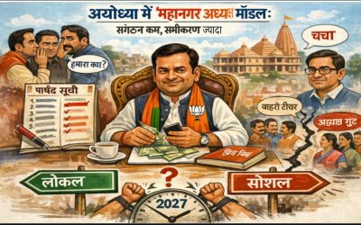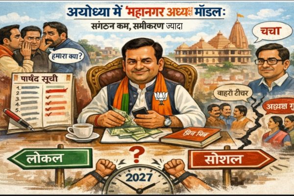 अयोध्या 18 मार्च 2026।अयोध्या की सियासत इन दिनों नामित पार्षदों की सूची से कम और महानगर अध्यक्ष कमलेश श्रीवास्तव के “मैनेजमेंट स्किल” से ज्यादा गरम है। संगठन के भीतर चल रही फुसफुसाहट अब खुलकर सवालों में बदलती दिख रही है—क्या महानगर अध्यक्ष का पद अब कैडर नेतृत्व से ज्यादा “संबंध प्रबंधन” का केंद्र बन गया…