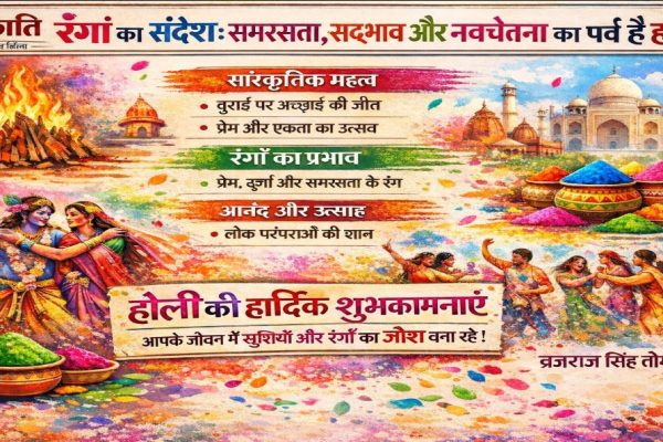 भोपाल/ग्वालियर 2 मार्च 2026। भारत की सांस्कृतिक परंपराओं में होली केवल रंगों का त्योहार नहीं, बल्कि सामाजिक समरसता, बुराई पर अच्छाई की विजय और नवचेतना का प्रतीक पर्व है। बदलते वैश्विक परिवेश में भी होली भारतीय संस्कृति की जीवंतता और सामूहिकता का अनुपम उदाहरण प्रस्तुत करती है। होली का आध्यात्मिक आधार हमें पौराणिक कथा में…