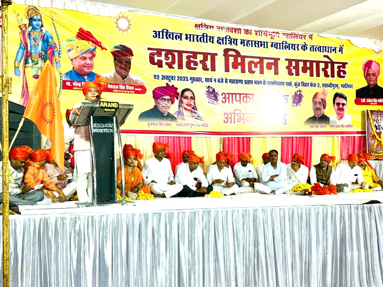 ग्वालियर 2 अक्बर 2025। अखिल भारतीय क्षत्रिय महासभा के तत्वावधान में वार्षिक दशहरा मिलन , शमी पूजन, शस्त्र पूजन एवं सहभोज का कार्यक्रम विजय दशमी के पावन पर्व पर महाराणा प्रताप पार्क, शताब्दीपुरम कुंज विहार फेज-2 पर आयोजित किया गया।