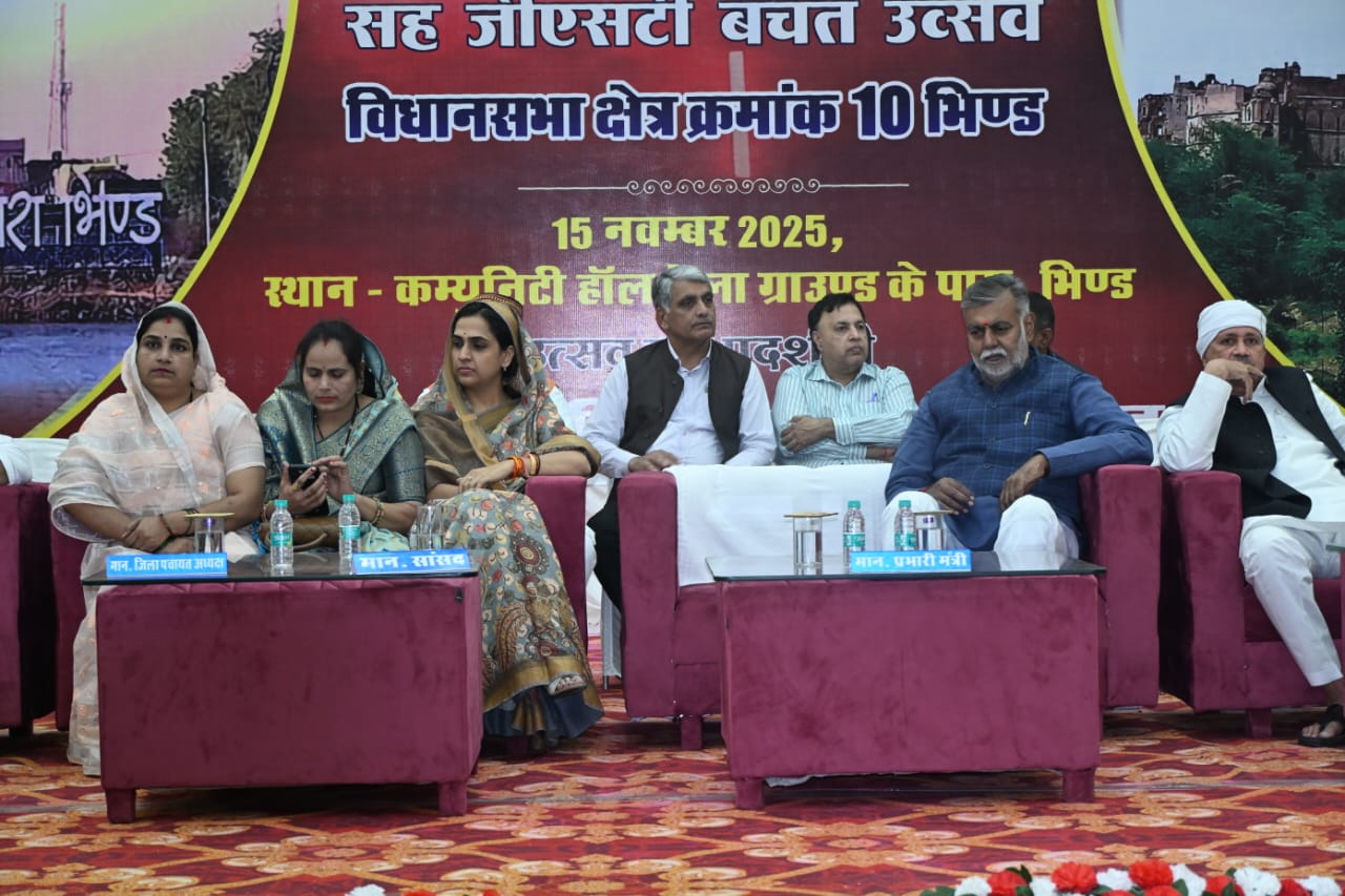 भिण्ड 15 नवम्बर 2025/ पंचायत एवं ग्रामीण विकास, श्रम मंत्री तथा जिले के प्रभारी मंत्री श्री प्रहलाद सिंह पटेल के मुख्य आतिथ्य में आत्मनिर्भर भारत अभियान सह जीएसटी बचत उत्सव कार्यक्रम कम्युनिटी हॉल मेला ग्राउंड भिण्ड के पास में आयोजित किया गया। इस दौरान विधायक भिण्ड श्री नरेन्द्र सिंह कुशवाह, जिला पंचायत अध्यक्ष श्रीमती कामना सिंह भदौरिया, भाजपा जिलाध्यक्ष श्री देवेन्द्र सिंह नरवरिया, नगर पालिका भिण्ड अध्यक्ष श्रीमती वर्षा बाल्मीकि, जनपद भिण्ड अध्यक्ष श्रीमती सरोज बघेल, कलेक्टर श्री किरोड़ी लाल मीना, पुलिस अधीक्षक डॉ असित यादव, सीईओ जिला पंचायत श्री सुनील दुबे सहित अन्य अधिकारी, जनप्रतिनिधिगण एवं गणमान्य नागरिक उपस्थित रहे।
