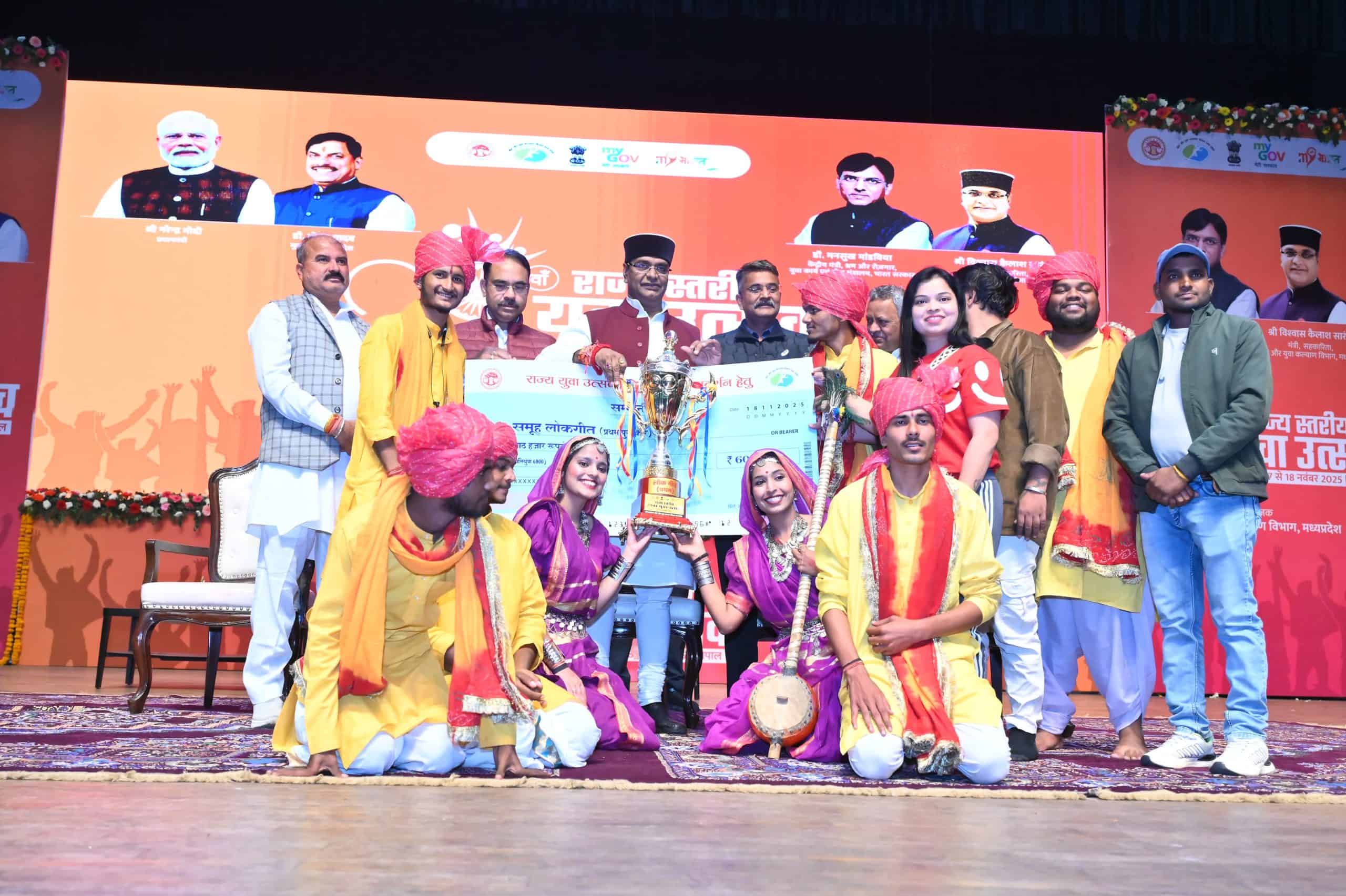 राज्य स्तरीय युवा उत्सव में भाषण विधा में प्रथम ग्वालियर संभाग के सोमेश, द्वितीय भोपाल संभाग के तनिष जैन और तृतीय इंदौर संभाग के सजल जैन रहे। कहानी लेखन में प्रथम शहडोल संभाग की कृति शुक्ला, द्वितीय उज्जैन संभाग के गोपाल मालवीय और तृतीय सागर संभाग की मायरा सिंघानिया, पेंटिंग में प्रथम ग्वालियर संभाग की अमृता धाकड़, द्वितीय इंदौर संभाग की संस्कृति श्रीवास्तव और तृतीय जबलपुर संभाग के सुयांश निखरे, कविता लेखन में प्रथम सागर संभाग के नकुल तिवारी, द्वितीय जबलपुर संभाग की काजल चक्रवर्ती और तृतीय नर्मदापुरम संभाग की वैशाली को सम्मानित किया गया। विज्ञान मेले में प्रथम सागर संभाग के समीर अहिरवार, द्वितीय नर्मदापुरम संभाग की प्रतिष्ठा सिंह ठाकुर और तृतीय रीवा संभाग के उत्कर्ष नामदेव रहे। इसी प्रकार समूह लोक गीत में प्रथम स्थान पर सागर संभाग, द्वितीय पर भोपाल संभाग और तृतीय स्थान पर शहडोल संभाग के युवा समूह रहे। समूह लोकनृत्य में प्रथम स्थान पर सागर संभाग, द्वितीय पर जबलपुर संभाग और तृतीय स्थान पर उज्जैन संभाग के युवा समूह को पुरस्कृत किया गया। युवा उत्सव में प्रतियोगिताओं के निर्णायकों को भी स्मृति चिन्ह प्रदान कर सम्मानित किया गया।