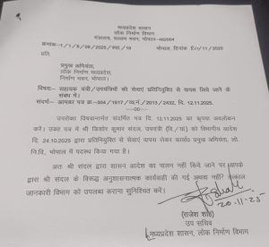 नई जारी चिट्ठी में स्पष्ट निर्देश दिए गए हैं कि-उपयंत्री किशोर कुमार सैंडल की प्रतिनियुक्ति, जिसे पहले ही समाप्त
