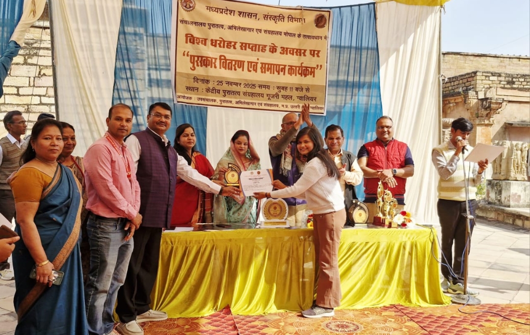 ग्वालियर 25 नवम्बर 2025/ विश्व धरोहर सप्ताह के समापन दिवस 25 नवम्बर को जिला पंचायत की अध्यक्ष श्रीमती दुर्गेश कुँवर सिंह जाटव द्वारा विभिन्न प्रतियोगिताओं के विजेताओं को पुरस्कार वितरित किए गए। केन्द्रीय पुरातत्व संग्रहालय गूजरी महल में पुरस्कार वितरण कार्यक्रम आयोजित किया गया। सप्ताह के आखिरी दिन “म्यूजियम वॉक” का आयोजन किया गया। जिसके तहत कार्यक्रम में शामिल अतिथियों, छात्र-छात्राओं, शिक्षकों एवं गणमान्य नागरिकों को गूजरी महल संग्रहालय का भ्रमण किया। बता दें ग्वालियर जिले में 19 से 25 नवम्बर तक विश्व धरोहर सप्ताह मनाया गया।