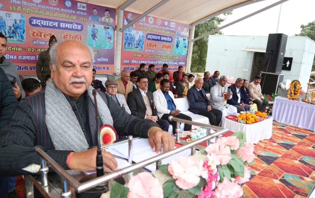 ग्वालियर 02 जनवरी 2026/ ऐतिहासिक नगरी ग्वालियर में 69वी राष्ट्रीय शालेय बालिका हॉकी प्रतियोगिता का विधानसभा अध्यक्ष श्री नरेन्द्र सिंह तोमर के मुख्य आतिथ्य में शुक्रवार को भव्य शुभारंभ हुआ। कम्पू स्थित राजमाता विजयाराजे सिंधिया खेल परिसर में 2 से 7 जनवरी तक आयोजित हो रही बालिकाओं के लिये 14 व 19 वर्ष आयु वर्ग की इस राष्ट्रीय हॉकी प्रतियोगिता में देश के विभिन्न राज्यों, केन्द्र शासित प्रदेशों एवं विभिन्न शिक्षा बोर्ड की कुल 27 टीमें भाग ले रही हैं। प्रतियोगिता के उदघाटन अवसर पर विधानसभा अध्यक्ष श्री तोमर ने कहा कि इस आयोजन में लघु भारत के सजीव दर्शन हो रहे हैं। उन्होंने कहा खेल का मैदान हमें अनुशासन सिखाता है। अनुशासित होकर ही देश को तेजी से विकास के पथ पर ले जा सकते हैं।