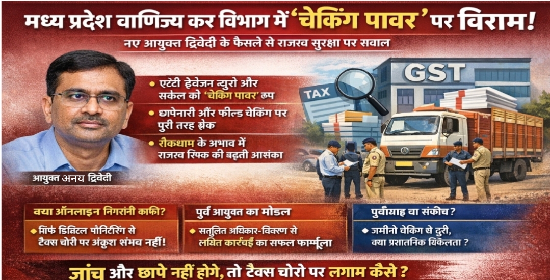 भोपाल। मध्य प्रदेश वाणिज्य कर विभाग में नए आयुक्त अनय द्विवेदी द्वारा अब तक एंटी इवेज़न ब्यूरो (AEB) सहित किसी भी विंग को “चेकिंग पावर” नहीं दिए जाने से विभागीय कार्यप्रणाली पर बड़ा प्रश्नचिह्न खड़ा हो गया है। मौजूदा स्थिति में न तो व्यापारियों के मालवाहक वाहनों की जांच संभव है और न ही किसी प्रतिष्ठान पर छापामार कार्रवाई—ऐसे में टैक्स चोरी पर अंकुश कैसे लगेगा, यह सबसे बड़ा सवाल बनकर उभरा है।