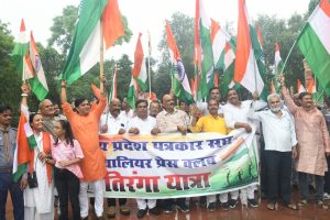 ग्वालियर । ग्वालियर प्रेस क्लब और मध्यप्रदेश पत्रकार संघ के संयुक्त तत्वाधान में फूलबाग स्थित प्रेस क्लब परिसर में आजादी की 77वी बर्षगाठ के अवसर पर 15 अगस्त 2024 को प्रातः 8 :30 ध्वजारोपण किया । ध्वजा रोपण उपरांत राष्ट्रीय गौरव के साथ तिरंगा यात्रा निकाली । तिरंगा यात्रा में शहर के पत्रकार,मीडियाकर्मी, साहित्यकार, फोटो जर्नलिस्ट ब्रह्मकुमारी , स्काउट गाइड, सहित अन्य सामाजिक संस्थाओ के पदाधिकारी शामिल थे । तिरंगा यात्रा को उप संचालक मधु सोलापुरकर ने झंडी दिखाकर रवाना किया । तिरंगा यात्रा आज 15 अगस्त 2024 को प्रातः 9: 30 बजे प्रेस क्लब भवन से शुरू होकर फूलबाग , वीरांगना लक्ष्मी बाई समाधी पर नमन कर वापस प्रेस क्लब पहुंची जहां ब्रह्माकुमारी आदर्श दीदी ने तिरंगा यात्रा का समापन किया । इस अवसर सामाजिक संस्थाओ के प्रतिनिधियों को सम्मानित किया ।