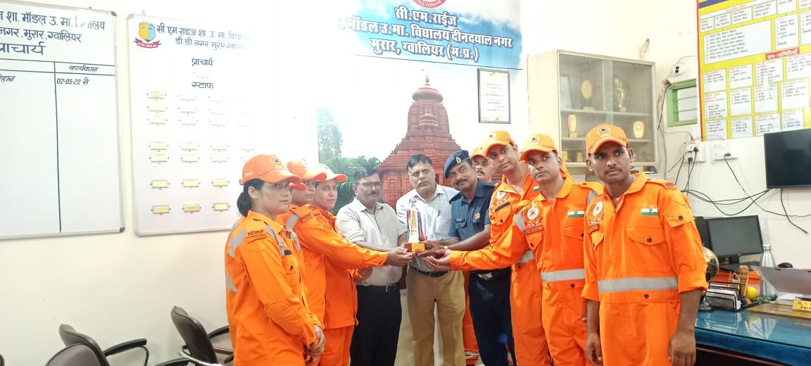 ग्वालियर। आज दिनांक 17 अगस्त 2024 को सी.एम.राइज विद्यालय शासकीय मॉडल स्कूल डी. डी. नगर, ग्वालियर में राष्ट्रीय आपदा मोचन बल (N.D.R.F.) की 8 वीं बटालियन की search and Rescue Team के द्वारा आपदा मोचन जागरूकता शिविर का आयोजन किया गया। शिविर में विभिन्न प्रकार की प्राकृतिक आपदाओं जैसे बाढ, भूकम्प, अग्नि आदि से स्वयं को सुरक्षित रखने एवं इनसे प्रभावित व्यक्तियों के बचाव हेत जानकारी एवं प्रशिक्षण प्रदान किया गया।इस टीम का नेतृत्व असिस्टेन्ट सब इंस्पेक्टर श्री रमाकान्त यादव 8 वीं बटालियन N. D.R.F द्वारा किया गया तथा टीम के सदस्य हवलदार श्री सन्तोष यादव, सिपाही परवीन, विश्वरूप, रोहित एवं अजय तथा वीरांगनाएं पूनम, ललिता, रिंकी एवं अल्का उपस्थित रहे।