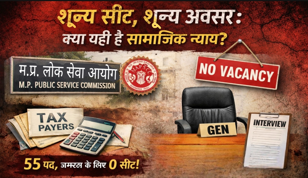 भोपाल/मध्यप्रदेश। सरकारी भर्तियों में अवसरों का संतुलन एक बार फिर सवालों के घेरे में है। स्वास्थ्य सेवाओं से जुड़े बीमा चिकित्सा पदाधिकारी (Health Insurance Officer) और सहायक शल्य चिकित्सक के 55 पदों पर इंटरव्यू घोषित हुए हैं, जिन्हें मध्य प्रदेश लोक सेवा आयोग द्वारा आयोजित किया जा रहा है_लेकिन चौंकाने वाली बात यह है कि इन सभी पदों में जनरल वर्ग के लिए एक भी सीट नहीं रखी गई है। यह सिर्फ एक भर्ती नहीं, बल्कि उस व्यवस्था पर बड़ा प्रश्नचिन्ह है जहां एक वर्ग को पूरी तरह बाहर कर दिया जाता है।